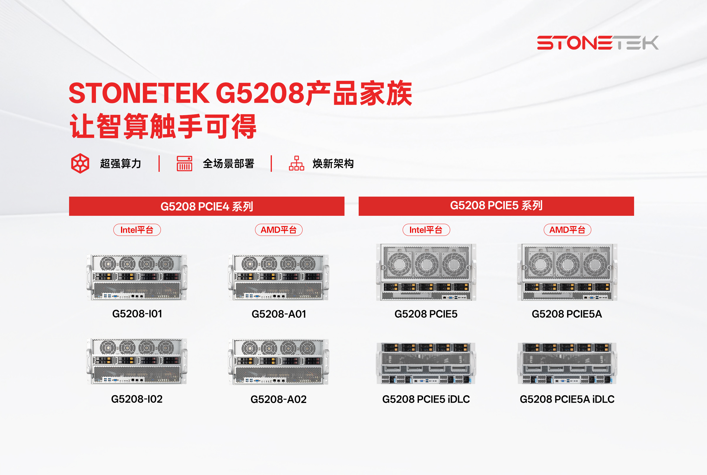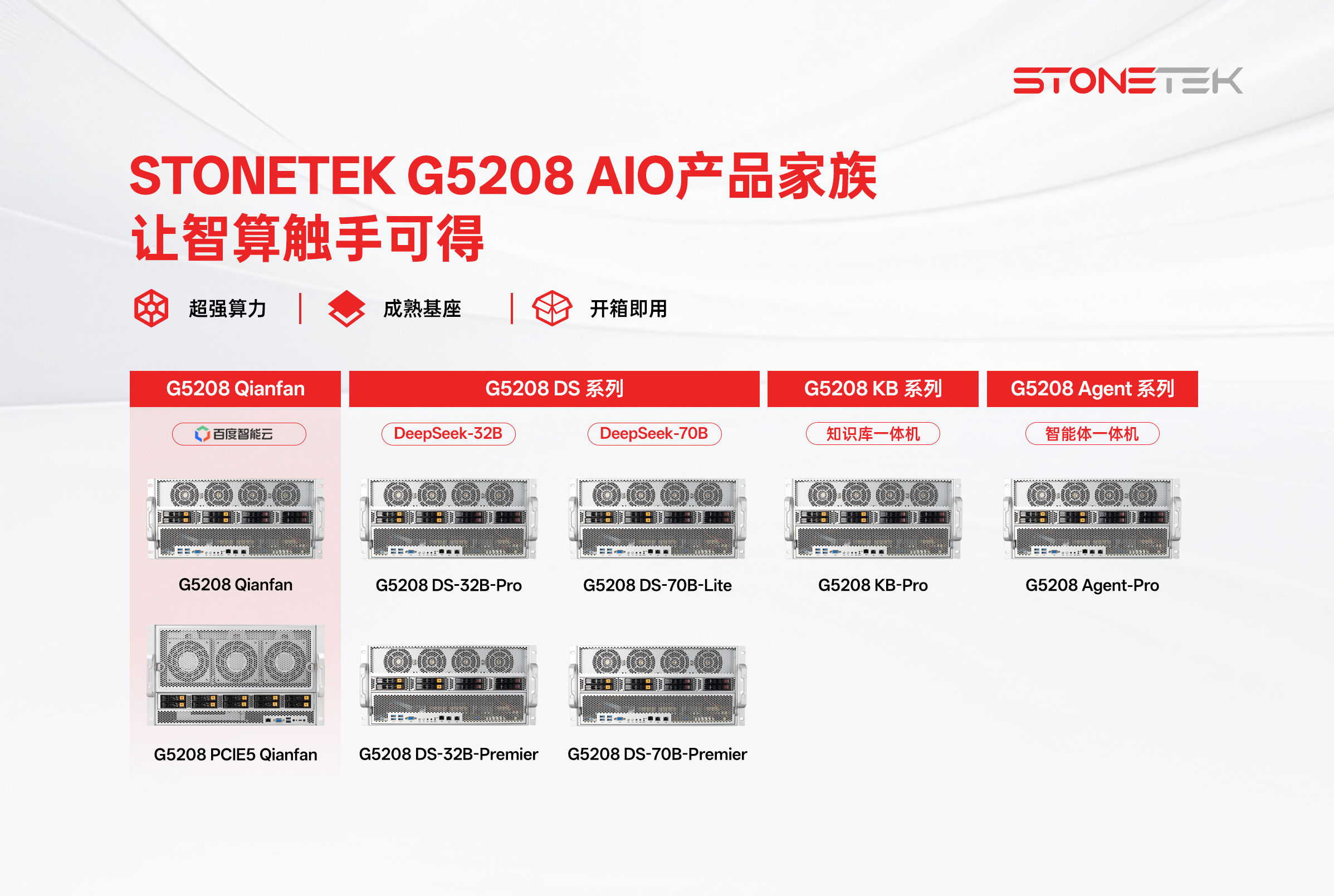 基于STONETEK SuperSvr G5208 AI智算服务器平台打造的一系列开箱即用的AI一体机解决方案产品。针对不同应用场景搭载定制化软件与功能组件,覆盖从模型推理、知识库管理到智能体开发等多种业务场景,帮助企业快速构建私有化AI平台,降低部署与运维复杂度,获得中国信通院“算模数用一体机”5A卓越评级。